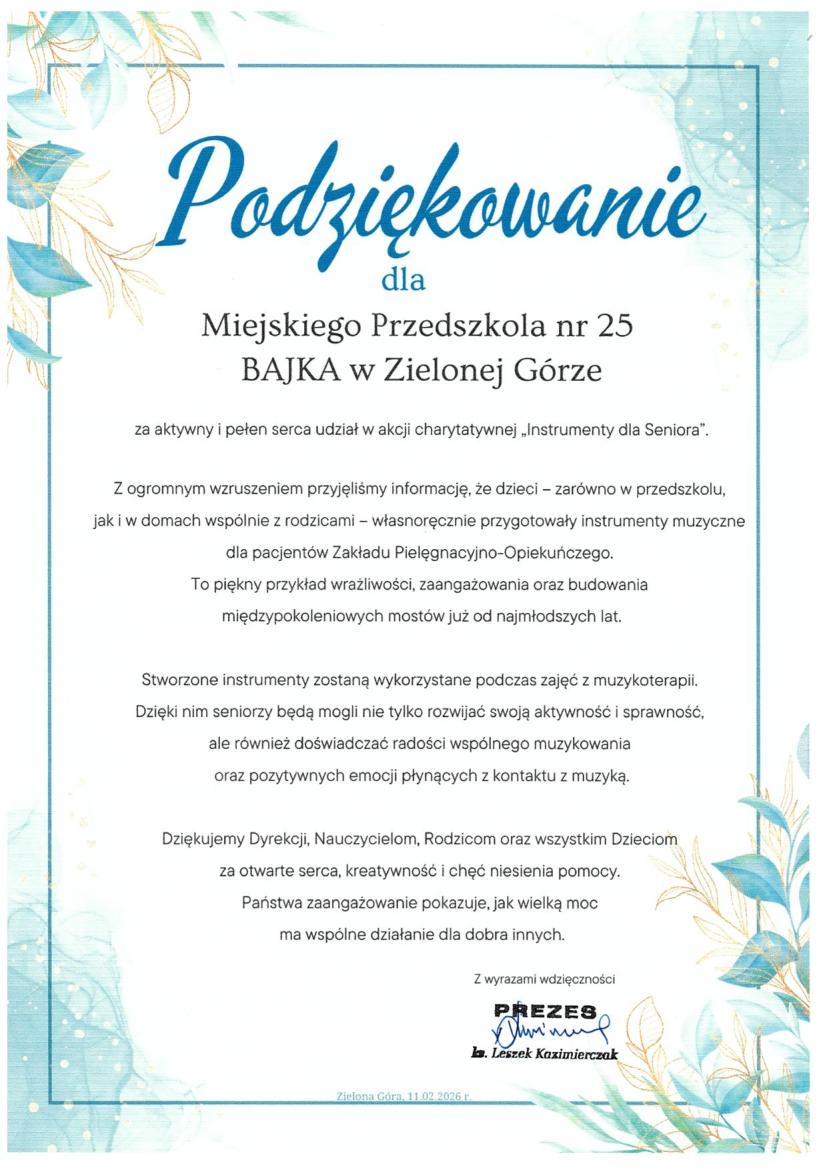 Największą radość sprawiła nam wiadomość, że seniorzy z powodzeniem wykorzystali przygotowane przez dzieci instrumenty podczas swoich zajęć. Muzyka połączyła pokolenia, wywołała wiele uśmiechu i stworzyła wyjątkową atmosferę pełną ciepła oraz wzruszeń.