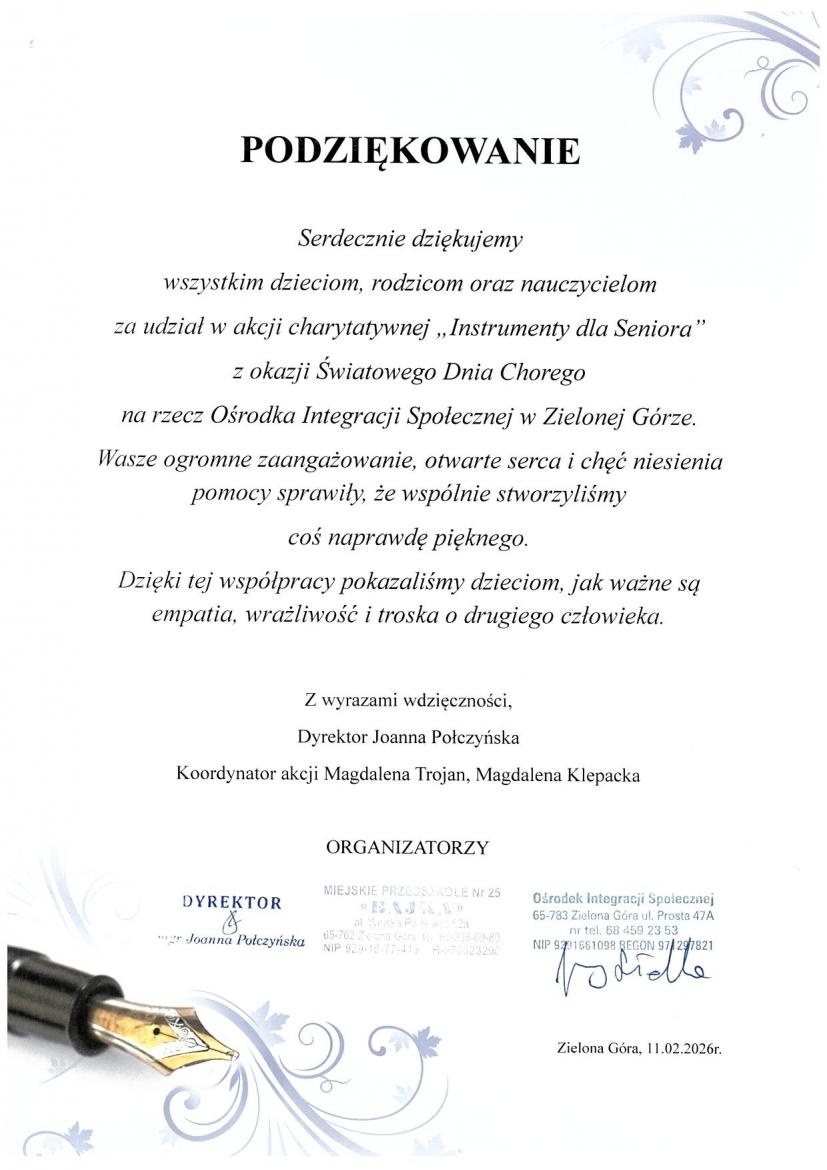 Zimową porą z okazji "Światowego Dnia Chorego" nasze przedszkole z radością włączyło się w akcję charytatywną „Instrumenty perkusyjne dla Seniora” organizowaną na rzecz Stowarzyszenia Ośrodka Integracji Społecznej. Celem przedsięwzięcia było własnoręczne przygotowanie instrumentów, które miały posłużyć seniorom podczas zajęć muzycznych i terapeutycznych.