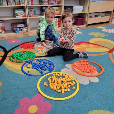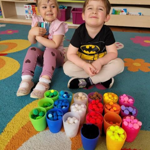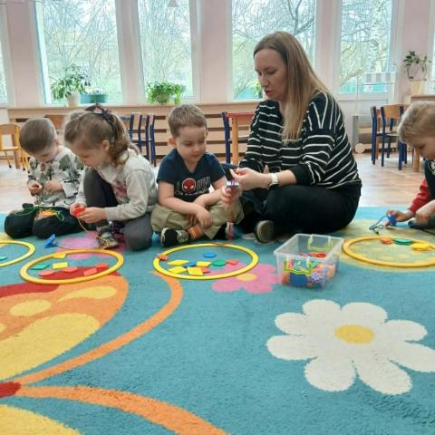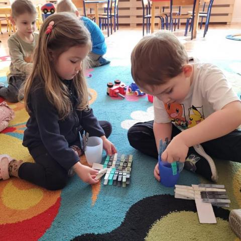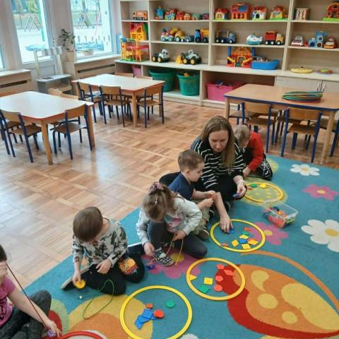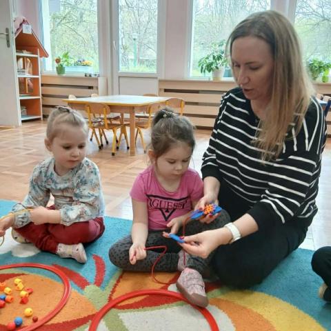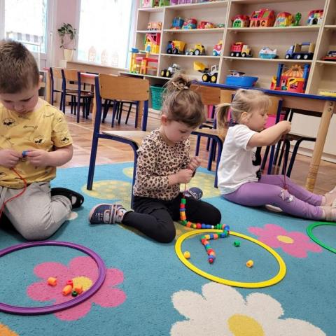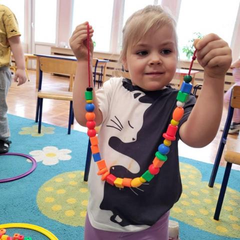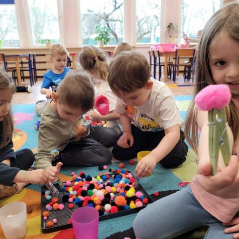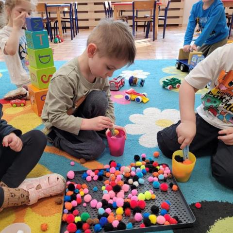 „Krasnoludki” uczestniczyły w zabawach z cyklu „Bystre oko i sprawne paluszki”, podczas których poprzez zabawę rozwijały koordynację wzrokowo-ruchową oraz sprawność manualną. Wykorzystując kolorowe kubeczki, łyżeczki, klamerki, sznureczki, koraliki, guziki i pluszowe pomponiki, doskonaliły prawidłowy chwyt oraz precyzję ruchów dłoni. Zajęcia sprzyjały również kształtowaniu uważności i koncentracji.