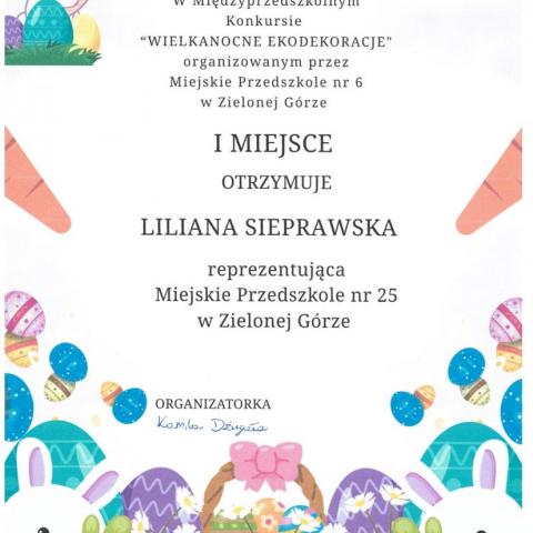 Z ogromną radością informujemy, że Liliana zdobyła I miejsce w międzyprzedszkolnym konkursie „Wielkanocne Ekodekoracje”! 🐣💚