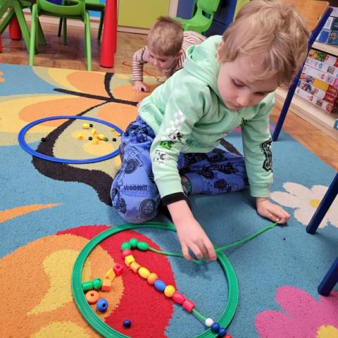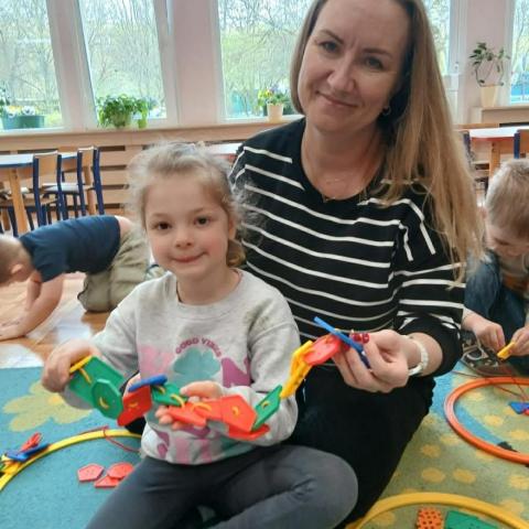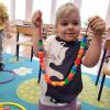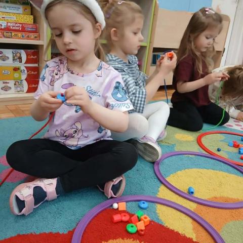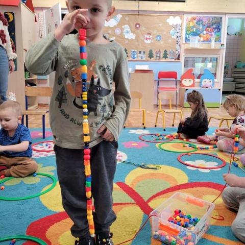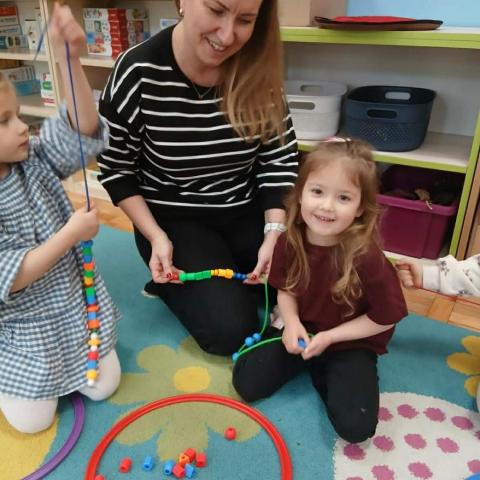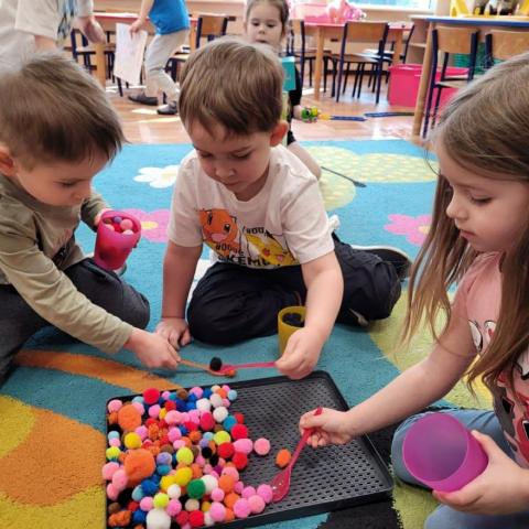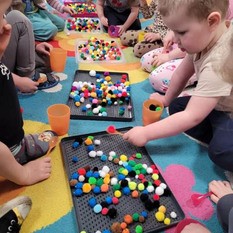 „Krasnoludki” uczestniczyły w zabawach z cyklu „Bystre oko i sprawne paluszki”, podczas których poprzez zabawę rozwijały koordynację wzrokowo-ruchową oraz sprawność manualną. Wykorzystując kolorowe kubeczki, łyżeczki, klamerki, sznureczki, koraliki, guziki i pluszowe pomponiki, doskonaliły prawidłowy chwyt oraz precyzję ruchów dłoni. Zajęcia sprzyjały również kształtowaniu uważności i koncentracji.